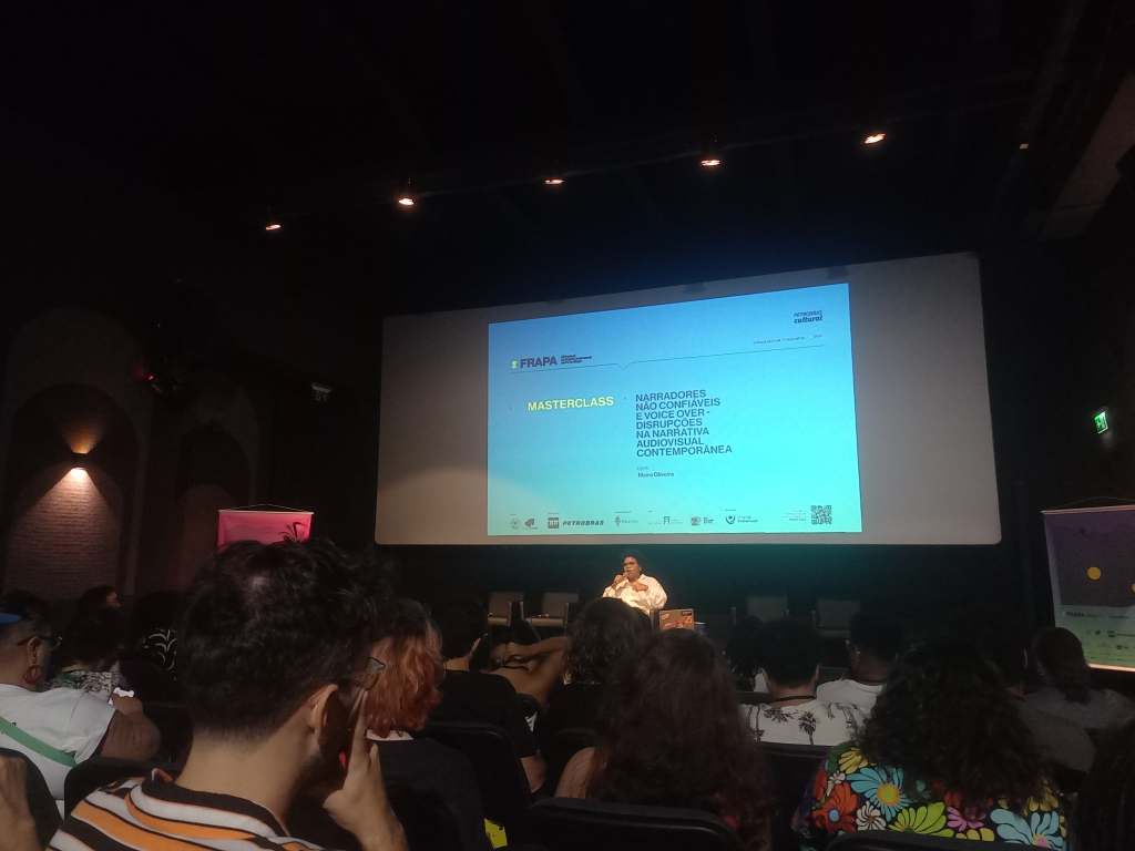 Outro evento que participei e achei muito interativo, ao mesmo tempo que técnico em diversas abordagens, foi a masterclass ministrada por Maíra Oliveira: “Narradores não confiáveis e voice over: disrupções na narrativa audiovisual contemporânea”.