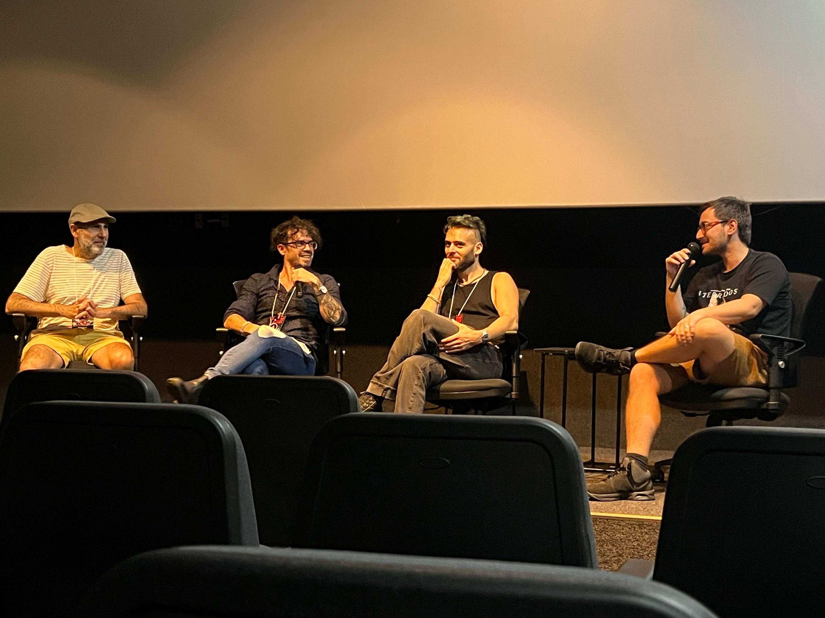 Da esquerda para a direita: Pablo Udenio, Sergio Podeley, Cristian Marchiori e o mediador João Pedro Teixeira, durante debate após a première de Gatilheiro. Foto: Alisson Santos/CineNewsPoa.
