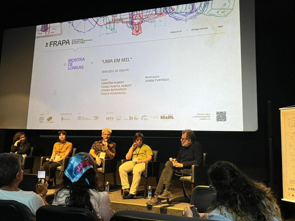 Equipe do filme durante o debate após a exibição de Uma em Mil no Frapa 2025. Recebendo também diversos elogios de Jorge Furtado que mediou o debate. Crédito: Alisson Santos/CineNewsPoa.