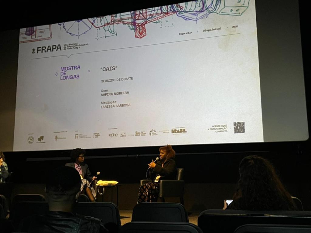 Diretora Safira Moreira (dir.) durante o debate após a exibição de Cais no Frapa 2025. Crédito: Alisson Santos/CineNewsPoa